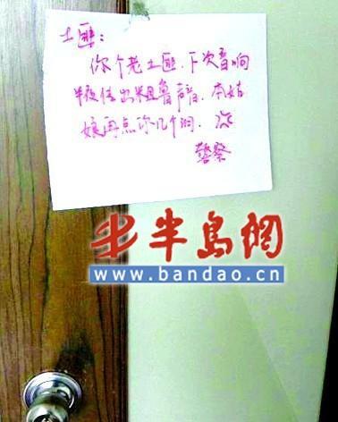 我是特別喜歡玩CS,玩了近5年,咋也不膩,腰不酸,腿也不疼,腦袋還特別好使。國慶前不久,早上起床收到鄰居“純爺們”貼在俺門上的一張紙條,看到“純爺們”發(fā)飆,趕緊拍下來留做紀念。人家在上面寫著:“你個老土匪,下次音響弄出粗暴聲音,本姑娘再給你在身上點幾個洞!”