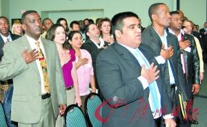 ▲美國(guó)一個(gè)州的新移民正在舉行宣誓入籍儀式。