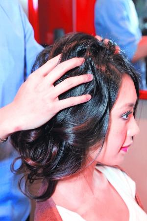 Step3將馬尾的頭發(fā)向內(nèi)屈,屈至中間時用發(fā)夾夾緊,側(cè)面的頭發(fā)則要稍微抓松。