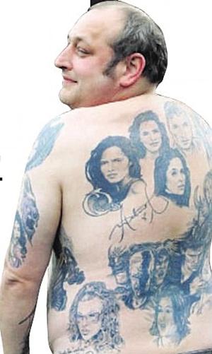 據英國媒體9日報道,英國41歲男子斯蒂夫·波特(右圖)堪稱是一名“超級追星族”,在過去10來年中,他將自己最喜愛的24名歐美影星和搖滾歌星的頭像都文在了自己的前胸、后背、臂膀以及大腿上。其中的12個明星還在波特的身體皮膚上留下了各自的親筆簽名。每當一個明星用筆在波特的皮膚上簽名后,波特就會立即趕往一個文身藝術家的工作室中,請文身藝術家將他最新得到的名人簽名也永久性地文在他的皮膚上。據悉,波特目前計劃申請吉尼斯世界紀錄。