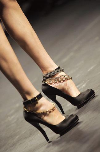 不景氣時(shí)期,女人的鞋跟似乎會(huì)變高,很顯然,本季天馬行空的鞋形正是對(duì)經(jīng)濟(jì)蕭條的一種藐視。然而關(guān)于高跟鞋究竟象征著女權(quán)還是男權(quán)的爭(zhēng)論已經(jīng)持續(xù)了幾十年,時(shí)尚史學(xué)家Giorgio Riello 與Peter McNeil 在《鞋子:從涼鞋到球鞋的歷史》一書中指出,1920 年代的婦女參政多以穿高跟鞋來展現(xiàn)女性特質(zhì),她們穿著鈕扣靴和高跟運(yùn)動(dòng)鞋向世人證明,參政并不會(huì)抹煞女人味。