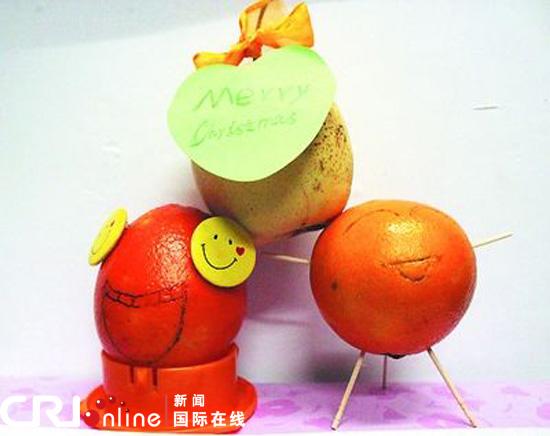“因為圣誕節(jié)就要到了,所以今年這個水果賀卡比較有新意,在我們大學(xué)生之間也比較流行這種方式。比如我手里的這個橙子,它的意義就是真誠,還有蘋果的意思就是平安。當(dāng)你把這個禮物送給別人的時候,他收到以后肯定很新奇,和收到紙質(zhì)賀卡不一樣的心情,減少浪費,比較適合現(xiàn)在過節(jié)的氣氛。”小姍說。