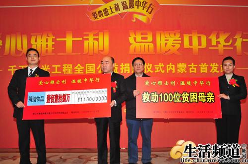 江南綠樹(shù)成蔭,塞北已然雪舞。一場(chǎng)面向全國(guó)范圍內(nèi)的“愛(ài)心雅士利,溫暖中華行” 千萬(wàn)陽(yáng)光工程全國(guó)公益捐贈(zèng)系列活動(dòng)11月10日上午首站內(nèi)蒙古。在呼和浩特市當(dāng)天舉辦的捐助發(fā)放儀式上,國(guó)內(nèi)知名奶粉企業(yè)雅士利集團(tuán)攜手中華慈善國(guó)際互聯(lián)網(wǎng)救助中心、內(nèi)蒙古扶貧基金會(huì),將捐贈(zèng)物資發(fā)放到亟需幫助的兒童福利院與貧困小學(xué)。內(nèi)蒙古自治區(qū)扶貧辦黨組成員副主任馮有恩、黨組成員副主任杜古、黨組成員紀(jì)檢組長(zhǎng)甄小兵及內(nèi)蒙古扶貧辦機(jī)關(guān)各處室及事業(yè)單位的主要領(lǐng)導(dǎo)出席了活動(dòng)。來(lái)自新華社內(nèi)蒙古分社、內(nèi)蒙古電視臺(tái)、呼和浩特電視臺(tái)、呼和浩特電臺(tái)、《內(nèi)蒙古日?qǐng)?bào)》、《內(nèi)蒙古晨報(bào)》、《北方新報(bào)》、《北方家庭報(bào)》、《呼和浩特日?qǐng)?bào)》、《乳業(yè)時(shí)報(bào)》、《香港商報(bào)》和《法制與社會(huì)雜志》等媒體記者共同見(jiàn)證捐助發(fā)放儀式。