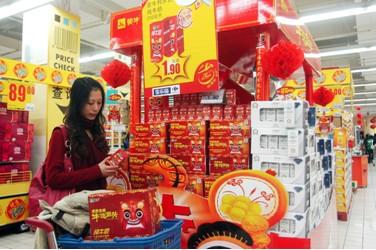 2月6日下午,記者來到雙井的一家超市,這里的蒙!芭_\(yùn)金虎”牛奶的銷售區(qū)也是人頭攢動,一位女士和老公在在貨架前仔細(xì)挑選。據(jù)這位女士介紹,她買牛奶是想送人,所以對產(chǎn)品品質(zhì)和包裝要求的比較高。當(dāng)他們看到蒙牛牛奶上這只喜氣洋洋的小金虎,覺得特別可愛也很喜慶,大紅的禮盒包裝、包裝上小老虎頭上的“!弊趾汀芭_\(yùn)當(dāng)頭”的寓意甚合他們的心意。