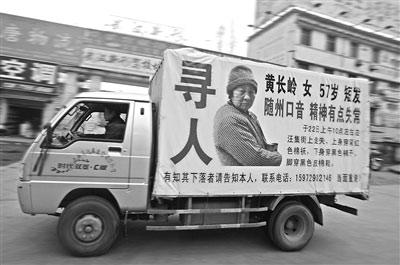 海報(bào)3米多長(zhǎng),1米多高,占據(jù)了整個(gè)貨柜車車廂的側(cè)面。海報(bào)上寫(xiě)著黃底紅字“尋人”,印著一名中年女子的照片。兒子李曉峰介紹,母親名叫黃長(zhǎng)嶺,57歲,短發(fā),隨州口音,走失時(shí)穿紅色棉襖,黑色褲子,腳穿黑色皮棉鞋。