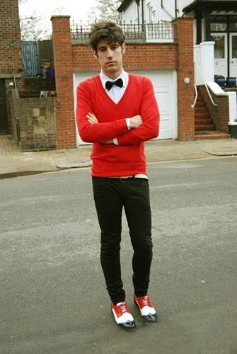 著裝智慧:①紅色拼接牛津鞋與紅色針織衫的呼應(yīng)。②黑色小領(lǐng)結(jié)的運(yùn)用。