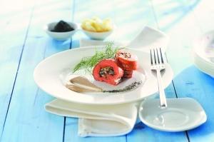 1.將鮮三文魚柳去皮,摘出魚刺和切去多余脂肪,用刀從魚柳中間向左右兩邊片開,但不要完全切斷,然后在三文魚上蓋上保鮮膜,用拍肉板輕輕地將魚肉拍成0.5cm薄片,再撒上檸檬皮碎、鮮蒔蘿碎、鹽(3g)和白胡椒粉(3g)調(diào)味。