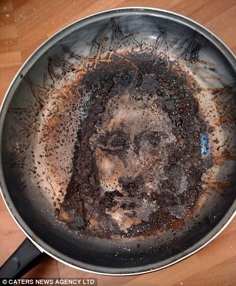 據(jù)英國(guó)《每日郵報(bào)》報(bào)道,英國(guó)一名22歲的銀行工作人員托比(Toby Elles)跟室友夜里在家中喝啤酒吃宵夜,但負(fù)責(zé)烹飪的他卻在沙發(fā)上睡著了,當(dāng)然熏肉也燒焦了,但鍋?zhàn)記](méi)有被燒破。當(dāng)托比把燒焦的熏肉刮除后發(fā)現(xiàn),鍋中剩余的油漬痕跡就像是一張人臉,搭配頭發(fā)、胡子,看起來(lái)就跟耶穌沒(méi)兩樣。