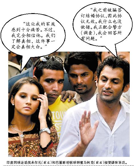 巴基斯坦板球明星舒艾卜·馬利克與印度知名網(wǎng)球運動員薩妮亞·米爾扎定于本月成婚,但婚禮前夕橫生枝節(jié)。印度警方5日沒收馬利克護(hù)照,禁止他離境,原因是另一名印度女子自稱已于2002年與馬利克結(jié)婚。