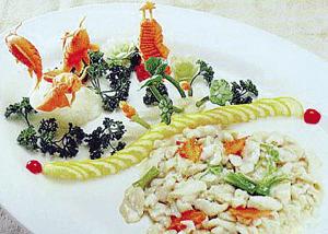 第二道墨魚籽花蝦則是以南瓜茸、蝦球、墨魚籽、麻油散子為原料制作而成,據(jù)了解,麻油散子是上海的傳統(tǒng)小吃,此菜在民間小吃的基礎上,增加墨魚籽、龍蝦肉等提鮮食材,經烹調融合為一體,彰顯清淡、環(huán)保、綠色。