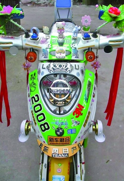 這輛電瓶車不得了,看車頭:寶馬、標(biāo)致、日產(chǎn)、東風(fēng)各種標(biāo)致全貼上了,還有可愛的helllo kitty 、snoopy等小掛飾,更加“致命”的是兩個反光鏡上還綁著兩朵大紅塑料花,就一輛電瓶車而言,可謂“風(fēng)騷”到了極點。