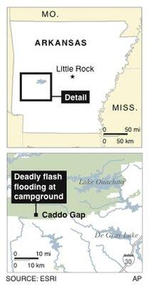 當(dāng)?shù)卣硎,將繼續(xù)在直升機(jī)配合下開展緊急搜救工作。一些救援人員表示,由于通信不暢,搶險隊可能要花上數(shù)周時間才能找到全部失蹤人員的下落。本次遭遇洪水襲擊的旅游區(qū)是阿肯色州著名的森林公園。這里壯觀的峽谷、美麗的溪流和郁郁蔥蔥的林木吸引了數(shù)百名來自美國各地的游客全家集體前往并在野外宿營。