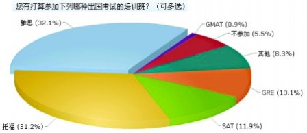 據(jù)相關報道,2009年中國托福考生人數(shù)較前年大幅增加30%,成為迄今參加托?荚嚨闹袊忌藬(shù)最多的一年。而隨著世界名校認可度的提升,雅思的市場份額也日益加大。啟德教育官方網(wǎng)在4月至6月間展開了“2010年中國首次中學生留學意向調(diào)查”,在本次調(diào)查中,選擇雅思和托?荚嚺嘤柊嗟幕境制剑謩e占32.1%和31.2%。數(shù)據(jù)統(tǒng)計結(jié)果如右圖: