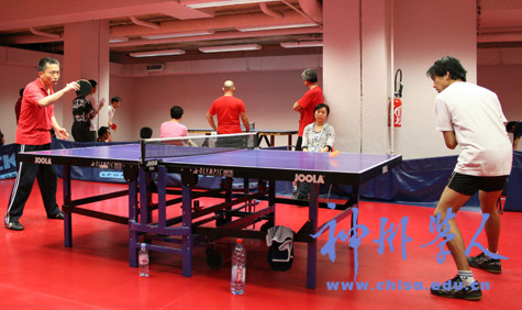 參賽的隊(duì)伍除了代表留法學(xué)子的學(xué)聯(lián)代表隊(duì)、學(xué)者隊(duì),還有使館老師們組成的使館隊(duì)和代表華僑的嶺南隊(duì),以及由3位留法學(xué)者子女組成的“希望隊(duì)”。本次比賽將參賽隊(duì)伍分為8個(gè)分隊(duì),以小組循環(huán)賽方式晉級(jí)。早上9:30分,32位參賽隊(duì)員已經(jīng)開(kāi)始練球熱身,安靜的球館頓時(shí)變得熱鬧起來(lái)。