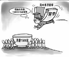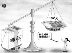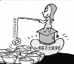 漫畫四:新浪網(wǎng)貼出的漫畫是一桿嚴重傾斜的秤,一頭是40萬百元大鈔,一頭是1500元大鈔,題為“留學所花40多萬元啥時才能賺夠本?”的文字說明憂心忡忡:不吃不喝,想要賺回40萬元得花20年。(萬建輝)