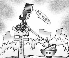 漫畫一:28日,《大眾日報》發(fā)表評論“海歸降薪求職敲響盲目留學警鐘”,所配漫畫海歸女孩站于博士帽和40萬元鈔票上,垂釣期望的1500元月薪。