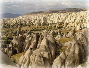 卡帕多奇亞位于土耳其安那托利亞(Anatolia)的腹地,在歷史上有很長一段時(shí)間與世隔絕,不通音信。在這里,自然的偉大力量鍛造出了世上獨(dú)一無二的神奇地貌。這種地貌的形成起源于幾百萬年前Erciyes、Hasandag和Golludag三座火山的噴發(fā)。噴出的大量巖漿冷卻、鈣化,凝固成的風(fēng)化巖層具有良好的可塑性,易于受腐蝕。之后,較耐腐蝕的玄武質(zhì)火山巖覆蓋了松軟的風(fēng)化巖層。隨著時(shí)光的流逝,玄武質(zhì)巖石碎裂,變得疏松,將松軟的風(fēng)化巖重又暴露出來。慢慢地,除了被玄武巖象傘一樣遮蓋起來的地方外,雨水把風(fēng)化巖石侵蝕出一條條溝壑,形成了陡峭的神奇煙囪景觀(fairy chimneys)。