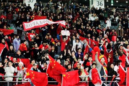 中新網(wǎng)2月11日電 據(jù)日本《中文導(dǎo)報》報道,2月10日,東亞四強賽進行第二輪爭奪,在東京味之素體育場中國男足迎戰(zhàn)韓國男足,中國隊最終以3-0大勝韓國隊,一舉改寫在國際A級賽事上32年對韓不勝的尷尬歷史?磁_上約二千名中國留學(xué)生的吶喊助威聲也貫穿了整場比賽。