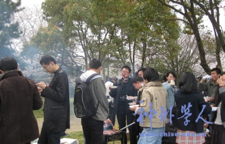 正午時分,同學(xué)們又回到賞花的大本營-----大濠公園櫻花樹下。“優(yōu)しい”的學(xué)友會負(fù)責(zé)人員已經(jīng)為大家準(zhǔn)備好了烤肉用的器具以及各種飲料。大家自覺地分成三、五人一組,圍著燒烤架邊聊天邊開始品嘗自己動手制作的美食。