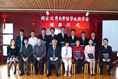 董大使首先向獲獎?wù)吆退麄兊膶?dǎo)師及親人表示熱烈的祝賀,向留瑞學(xué)人表示親切的問候。他指出,設(shè)立“國家優(yōu)秀自費留學(xué)生獎學(xué)金”是新時期貫徹國家“支持留學(xué),鼓勵回國,來去自由”留學(xué)工作方針的重要舉措,自2003年設(shè)立以來累計獲獎人數(shù)已達1900余人。2009年度共497人獲獎,其中瑞士有15位在校博士生獲得這一殊榮。這是歷年來獲獎人數(shù)最多的一次,顯示了在瑞士中國留學(xué)人員的實力和水平。