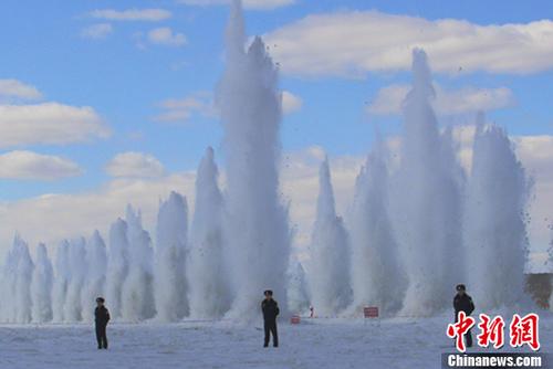 黑龍江即將開河 冰凌爆破激起百米“冰瀑”