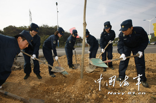 11月6日,東海艦隊某水警區(qū)20名官兵來到駐地經(jīng)濟開發(fā)區(qū)開展軍民秋季綠化植樹活動。寒風中官兵們奮戰(zhàn)半個多小時,300顆左右的樹木挺立在荒蕪的土地上,頓時變得生機盎然起來。拍下身上的塵土,大家紛紛表示能在喜迎黨的十八大之際,為建設(shè)第二故鄉(xiāng)貢獻力量,很開心。