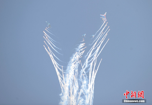 蘇-27編隊(duì)在藍(lán)天上咆哮,俄羅斯雄壯、富有節(jié)奏感的音樂在地上為它們伴奏,充滿力量的“空中芭蕾”令現(xiàn)場觀眾熱血沸騰。