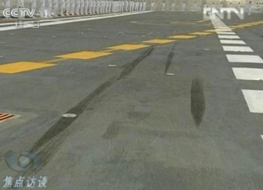 甲板上清晰的艦載機留下的輪胎印。(央視截圖)