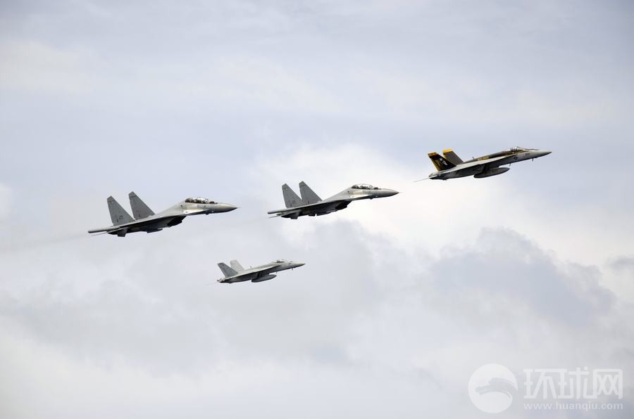 馬來西亞海軍的蘇-30戰(zhàn)機(jī)與美國海軍的F/A-18戰(zhàn)斗機(jī)組成編隊從華盛頓號航母上空飛過