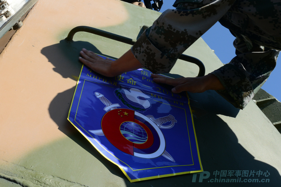一名戰(zhàn)士給將要出征的戰(zhàn)車貼上演習圖標