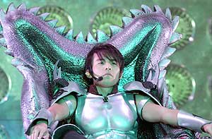演唱會花樣百出,周杰倫穿上銀色盔甲,演唱開場的變奏版《雙截棍》,接著在巨大籠子里唱《半獸人》時(shí),舞者還搭配扮成獸人群魔亂舞;唱完龍騰虎躍現(xiàn)場擊鼓式的《龍拳》,突然從天而降一個(gè)籃球架,讓周杰倫大展球藝;接著再演唱具濃厚中國風(fēng)味的《斗牛》等;不論是服裝造型或是舞臺機(jī)關(guān),都叫人眼花繚亂。