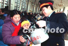 春運(yùn)即將來臨,一些北京民工提早收工紛紛踏上返鄉(xiāng)之路。北京火車站的服務(wù)員正在為旅客熱情服務(wù)。作者:張勤