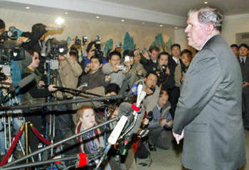 關于朝核問題,李肇星說,中方堅持維護朝鮮半島的和平與穩(wěn)定,支持朝鮮半島實現(xiàn)無核化,不贊成在半島上出現(xiàn)核武器,主張通過對話和平解決問題。中方不贊成朝方退出《不擴散核武器條約》(NPT)。