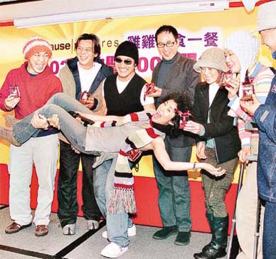 梁家輝與吳君如及其他演員陳奕迅、黃日華、張堅庭、杜汶澤、田蕊妮等同坐一席時,談笑風(fēng)生,連上臺也要搞搞氣氛,叫眾演員來個“眾星拱如”將君如捧起。吳君如為慶!督痣u》上映兩周,票房上佳,前晚不但設(shè)慶功宴慰勞大家,還自掏腰包買了八粒小金雞答謝一班有份在片中客串演出的“嫖客”好友。