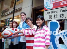 “香港國際七人欖球賽”將于3月底于香港大球場舉行,1月23日模特在中環(huán)蘭桂坊展示今屆欖球賽的服飾。洪少葵 攝