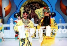 著名京劇表演藝術(shù)家梅葆玖與影壇名人盧燕女士,在“2003中央電視臺(tái)春節(jié)聯(lián)歡晚會(huì)”彩排中表演京劇《太真外傳》。作者:王新