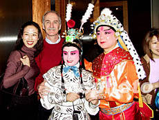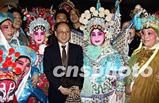 由美國齊淑芳京劇團演出的全本中國京劇《楊門女將》1月25日晚在紐約百老匯完成首次演出,這是繼1930年梅蘭芳在紐約演出以來中國京劇又一次登上百老匯舞臺。圖為中國駐紐約總領(lǐng)事張宏喜祝賀演出成功。作者:趙海燕