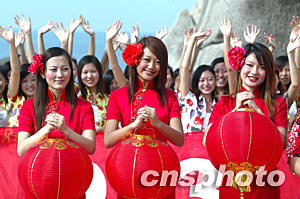 春節(jié)臨近,中國著名模特杜鵑、賈妮妮、包玉蘭(從左至右)手持大紅燈籠,與二百模特佳麗做秀海南三亞天涯海角,參加“三亞與美麗同行活動(dòng)”,營造節(jié)日喜慶氣氛,迎接即將到來的中國農(nóng)歷羊年。作者:毛建軍
