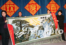國務(wù)院僑辦主任陳玉杰(右一)與副主任李海峰(左一),二十七日在僑辦新春聯(lián)歡會上,代表國務(wù)院僑辦機(jī)關(guān)接受機(jī)關(guān)定點(diǎn)扶貧地區(qū)甘肅積石山縣代表贈送的新年壁毯禮品。作者:鄒憲