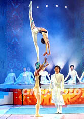 中國(guó)新秀魏葆華和吳正丹在北京春節(jié)晚會(huì)上表演雜技《梁祝·化蝶》,此節(jié)目曾經(jīng)獲得第二十六屆蒙特卡羅金小丑芭蕾舞金獎(jiǎng)。作者:王新