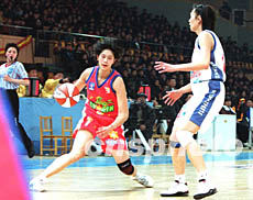 一月二十八日晚,2003中國女籃WCBA全明星賽在河北省秦皇島市奧體中心開賽,八一隊(duì)隊(duì)員隋菲菲(左)第二次獲得聯(lián)賽最有價(jià)值球員稱號(hào)。作者:廖文靜