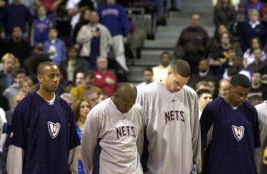 美國(guó)航天飛機(jī)哥倫比亞號(hào)于北京時(shí)間昨天晚間失事,機(jī)上全部7名宇航員全部罹難。圖為美國(guó)NBA比賽開(kāi)始前,新澤西網(wǎng)隊(duì)隊(duì)員為遇難者進(jìn)行默哀。他們?cè)诮裉毂荣愔械膶?duì)手是底特律活塞隊(duì)。