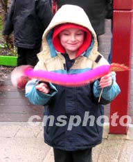 農(nóng)歷新年,英國曼徹斯特唐人街舉行盛大賀歲活動,圖為英國小童饒有興趣地玩“中國龍”。 盧峰 攝