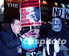 當(dāng)?shù)貢r(shí)間二月五日,在鮑威爾向聯(lián)合國(guó)提交伊拉克擁有大規(guī)模殺傷性武器新證據(jù)的同時(shí),數(shù)百人在紐約時(shí)代廣場(chǎng)集會(huì),反對(duì)美國(guó)對(duì)伊拉克開(kāi)戰(zhàn)。傍晚時(shí),越來(lái)越多下班的紐約人自動(dòng)加入,集會(huì)遂演變?yōu)檠刂氖中羞M(jìn)的反戰(zhàn)示威游行。圖為帶著布什面具的示威者。作者:龔文謨