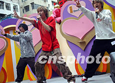 香港音樂(lè)組合E-KIDS二月九日在銅鑼灣時(shí)代廣場(chǎng)舉行的情人節(jié)“戀人短訊”大募集活動(dòng)上助興演唱,吸引眾多歌迷。
