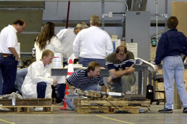 從路易斯安娜和德州經(jīng)過分析對比后的“哥倫比亞”號殘骸被陸續(xù)運抵位于弗羅里達的肯尼迪航天中心,展開更深入的調查失事原因工作。圖為KSC工作人員接收殘骸物件進行匯總登記。