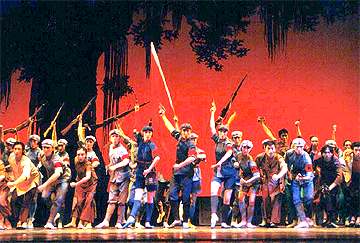 自從1964年公演以來,芭蕾舞劇《紅色娘子軍》廣受各界人士推崇。當(dāng)年老一輩藝術(shù)工作者在創(chuàng)作該劇時,曾到娘子軍的故鄉(xiāng)海南島深入生活。劇中射擊、投彈、刺殺的舞蹈是軍隊動作與芭蕾舞足尖技巧的結(jié)合,生動地塑造出了女戰(zhàn)士們的颯爽英姿。此外,像“五寸刀舞”、“軍民聯(lián)歡舞”、“黎族少女舞”、“大刀舞”、“紅軍過場”等舞段給觀眾留下了深刻的印象。