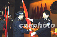 十四日,北京警方舉行治安系統(tǒng)“兩會”安全保衛(wèi)動員大會,公安局長馬振川(右)為“兩會”治安保衛(wèi)突擊隊授旗。作者:任海霞