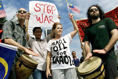 而在亞洲及澳洲,一些國家今日已展開反戰(zhàn)示威游行,泰國、馬來西亞及新西蘭等國均有示威活動。在泰國有大約3000人上街示威,高喊反戰(zhàn)口號,而新西蘭有數(shù)以萬計(jì)的示威者走上上街頭反對美對伊開戰(zhàn)。