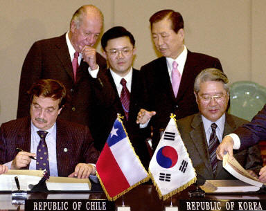 韓國和智利政府15日在漢城簽署了自由貿(mào)易協(xié)定,為擴大兩國間的貿(mào)易創(chuàng)造條件。這是韓國與外國簽署的第一個自由貿(mào)易協(xié)定。